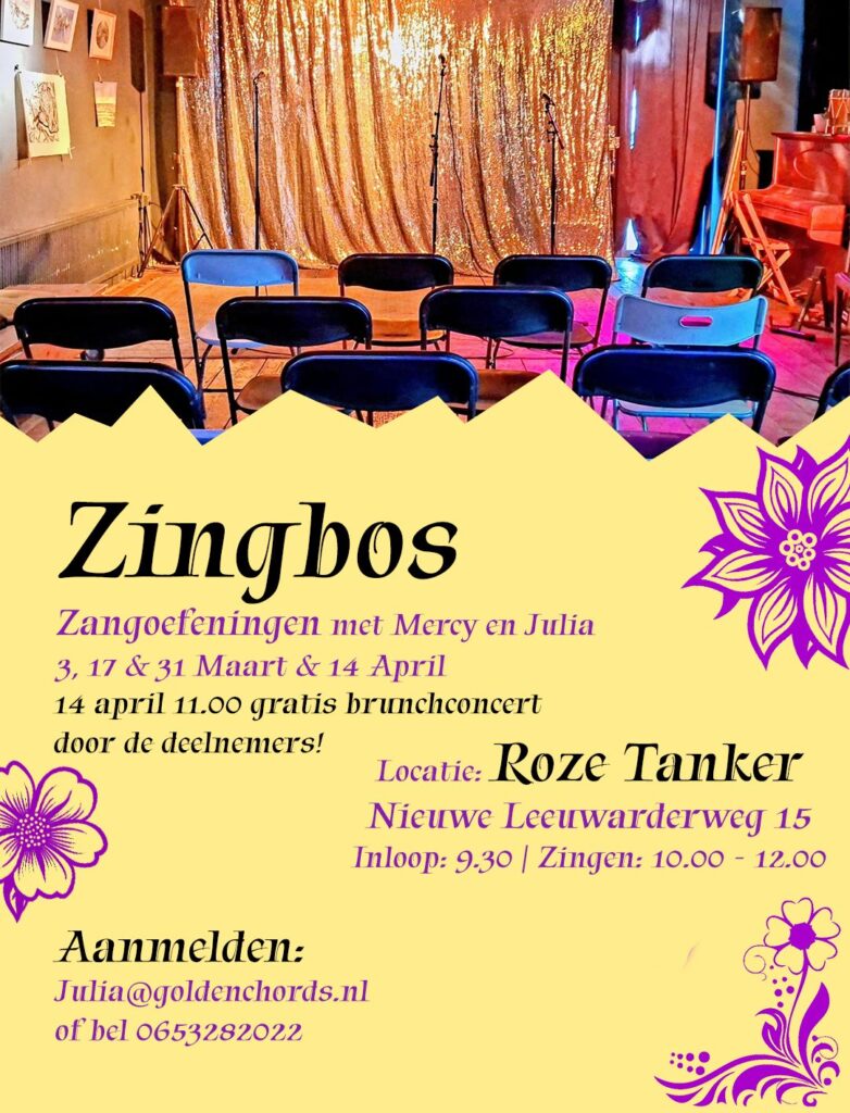 Golden Chords bevordert zang en muziekbeleving via een gospelkoor; Gospelkoor Noord. We zijn een buurtkoor in Oud Noord en we repeteren in de Roze Tanker. Dat doen we onder begeleiding van een echte gospelzangeres en we geven daar ook minstens 2 keer per jaar een Show voor de buurt. We staan voor inclusie, inspiratie en het delen van rijke muzikale tradities, met een focus op American Gospel. Het Gospelkoor Noord is niet zomaar een koor, maar een koor waar je ook iets meer leert over de achtergrond van American gospel, waar wordt gewerkt aan saamhorigheid, creativiteit en onderling begrip en waar hokjes worden afgebroken. Verder organiseren we regelmatig weer de Zingbosochtend: Gezamenlijk zangoefeningen doen op dinsdagochtend in de Tanker in Amsterdam Noord, inloop 9.30, zingen van 10.00 tot 12.00. Voor aanmelding mail: julia@goldenchords.nl. De eerstvolgende brunchuitvoering van deelnemers van Zingbos is op 14 april 2026 om 11.00 in de Roze Tanker. De toegang is gratis.